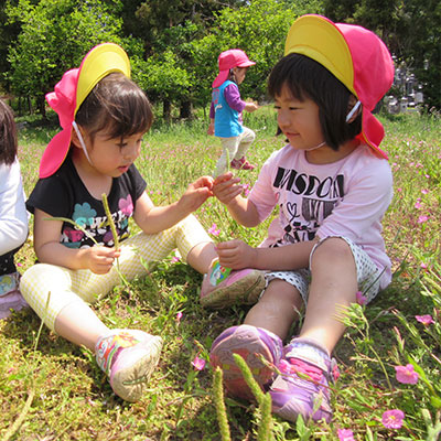 | その他 | 主体的な活動とは 子どもたちはあそぶことが大好き。あそびの中からたくさんの体験を積んでいくことで探求心をくすぐられ、「もっと知りたい」「こんなこともやってみたい」という思いがわいてきます。自分でやりたいことを見つけて、失敗しても自分で克服していけるような子どもになって欲しいという考えから主体的な活動の時間を保育の中に取り入れています。 食育 食育計画の目標を「たのしく食べる」とし全園児がたのしく食べられるよう取り組んでいます。 バランスのとれたおいしい給食の提供はもちろん、エプロンシアターやパネルシアターで『たべものの冒険』や『マナー』を楽しく覚えています。夏野菜作り体験やおやつ作り体験を通して食への興味関心を深めています。 |
