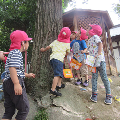 *裏山コース:園の周りの田んぼや畑を過ぎると緩やかな坂道を上ったり下ったりしてほどなく裏山に到着します。どんぐりや松ぼっくりがたくさん落ちている魅力的な場所です。さらに足を延ばし裏山を抜けると学校が見えてきます。裏山を一周することもできます。