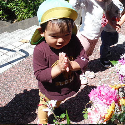 *お寺コース:園に隣接するお寺(理事長先生が住職)の石段を上ったり下りたり、鐘楼堂の隣の畑に咲いているひまわりやマリーゴールドのお花をのんびり見たりできる、よちよち歩きの0・1才児に人気のコースです。