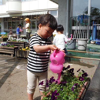 | その他 | 主体的な活動とは 子どもたちはあそぶことが大好き。あそびの中からたくさんの体験を積んでいくことで探求心をくすぐられ、「もっと知りたい」「こんなこともやってみたい」という思いがわいてきます。自分でやりたいことを見つけて、失敗しても自分で克服していけるような子どもになって欲しいという考えから主体的な活動の時間を保育の中に取り入れています。 食育 食育計画の目標を「たのしく食べる」とし全園児がたのしく食べられるよう取り組んでいます。 バランスのとれたおいしい給食の提供はもちろん、エプロンシアターやパネルシアターで『たべものの冒険』や『マナー』を楽しく覚えています。夏野菜作り体験やおやつ作り体験を通して食への興味関心を深めています。 |